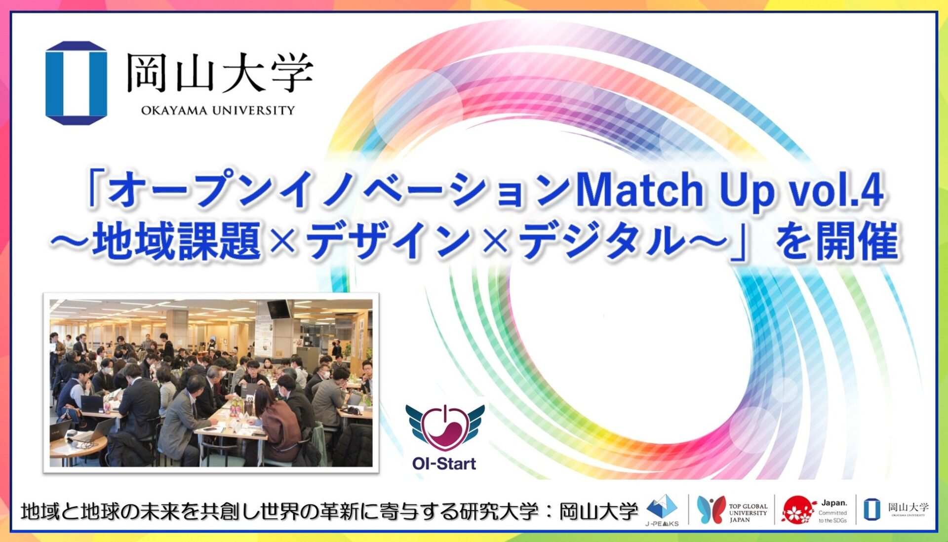 国立大学法人岡山大学(本部:岡山市北区、学長:那須保友)が事務局を務めるおかやまデジタルイノベーション創出プラットフォーム(OI-Start)は、2026年1月8日に岡山県立大学において、「オープンイノベーションMatch Up vol.4 ~地域課題×デザイン×デジタル~」を主催し、220人以上が参加しました。