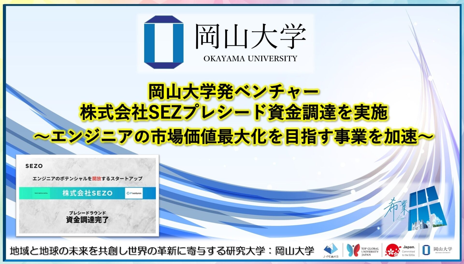 国立大学法人岡山大学(本部:岡山市北区、学長:那須保友)の大学発ベンチャーである株式会社SEZOは、TRUST SMITH & CAPITALおよびF Venturesを引受先とする第三者割当増資により、プレシードラウンド※での資金調達を実施しました。