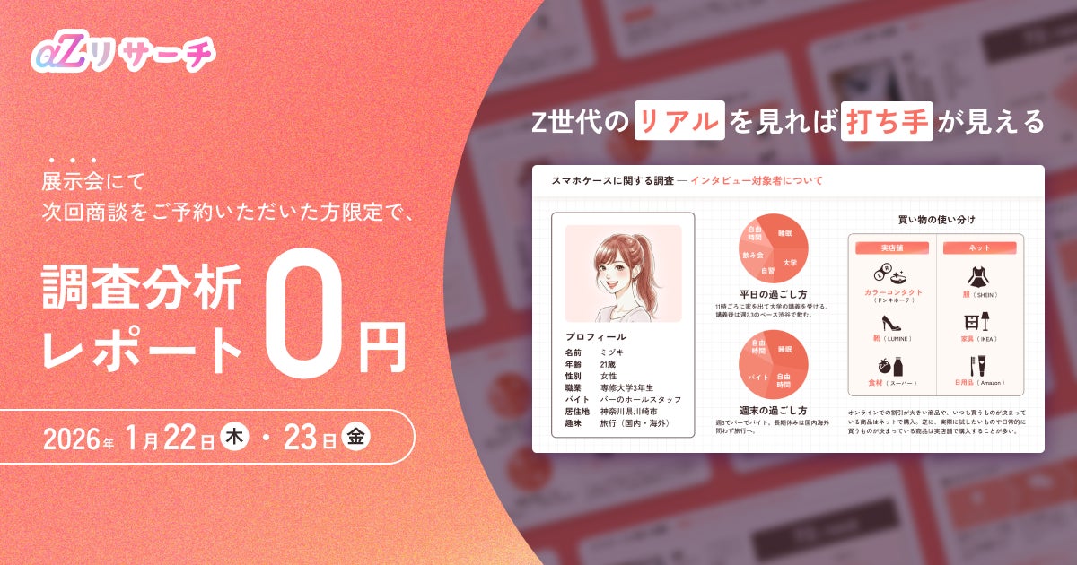 当社ブースでは、Z世代本人への定性インタビューを通じて“データだけでは捉えられないリアルな意識”を可視化するリサーチ手法や、企業との共創事例を紹介します。