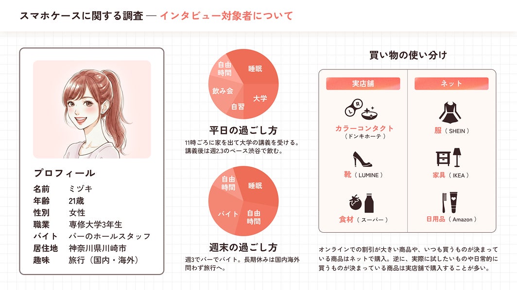 リサーチ後はこのようなレポートを納品いたします。インタビュー結果はもちろん、そこから見えたターゲットのインサイトを分析し、具体的な施策案まで落とし込みます。