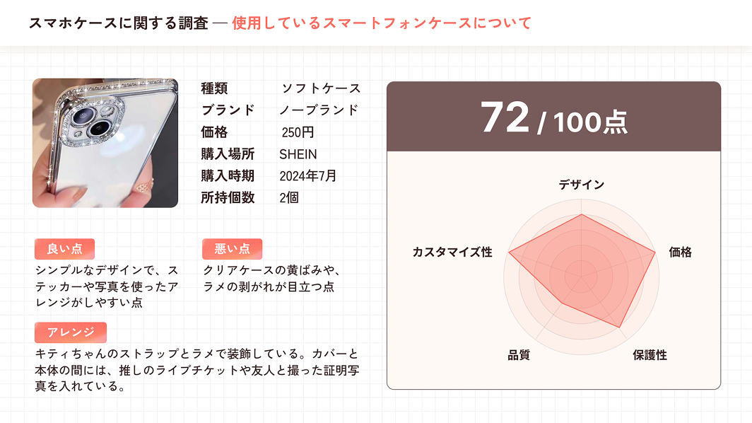 リサーチ後はこのようなレポートを納品いたします。インタビュー結果はもちろん、そこから見えたターゲットのインサイトを分析し、具体的な施策案まで落とし込みます。