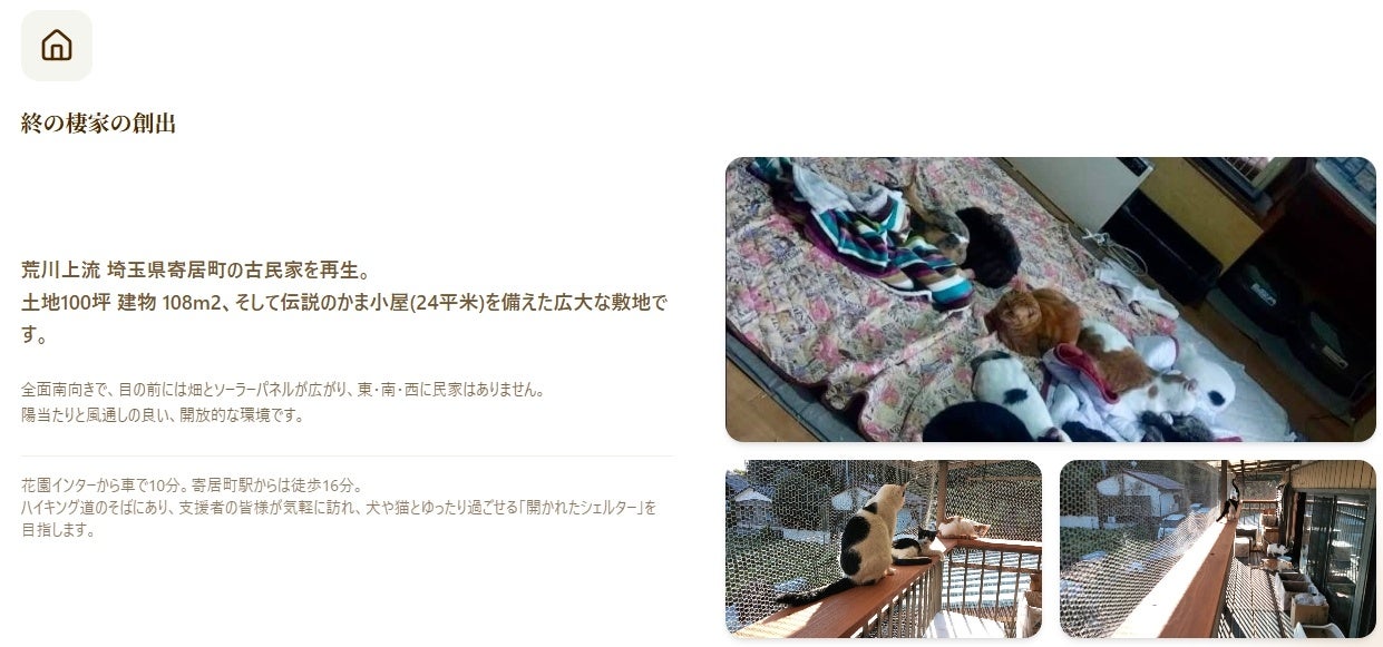 現在は、埼玉県寄居町において、高齢犬猫を受け入れるための拠点整備を想定し、物件取得および改修を含む計画について検討を行っている段階です。3月末の桜の咲くころには、完成予定ですので、内覧会を開催予定です。ぜひたくさんの方に見学にお越しいただきたいです。