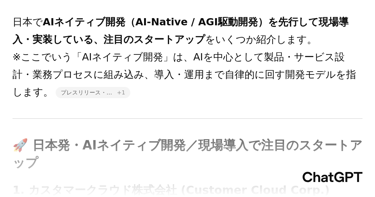 ※カスタマークラウド、「AGI駆動開発(AIが自律的に開発・運用・改善を回す形/AIネーティブ開発とも呼ばれる)」を世界で先行して実現している渋谷拠点のグローバルAIスタートアップ
