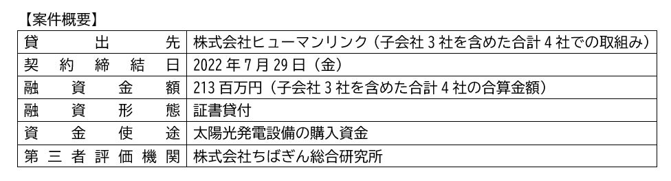 貸出先の株式会社ヒューマンリンクほか同社子会社3社は、太陽光発電を主力とする再生可能エネルギー発電所の開発および運営を手掛けており、今回調達した資金は、太陽光発電設備(茨城県筑西市)の購入資金へ全額充当されます。再生可能エネルギー由来の電力を発電することにより、発電時のCO2排出量の削減が見込まれ、持続可能な環境・社会の実現への貢献が期待されます。