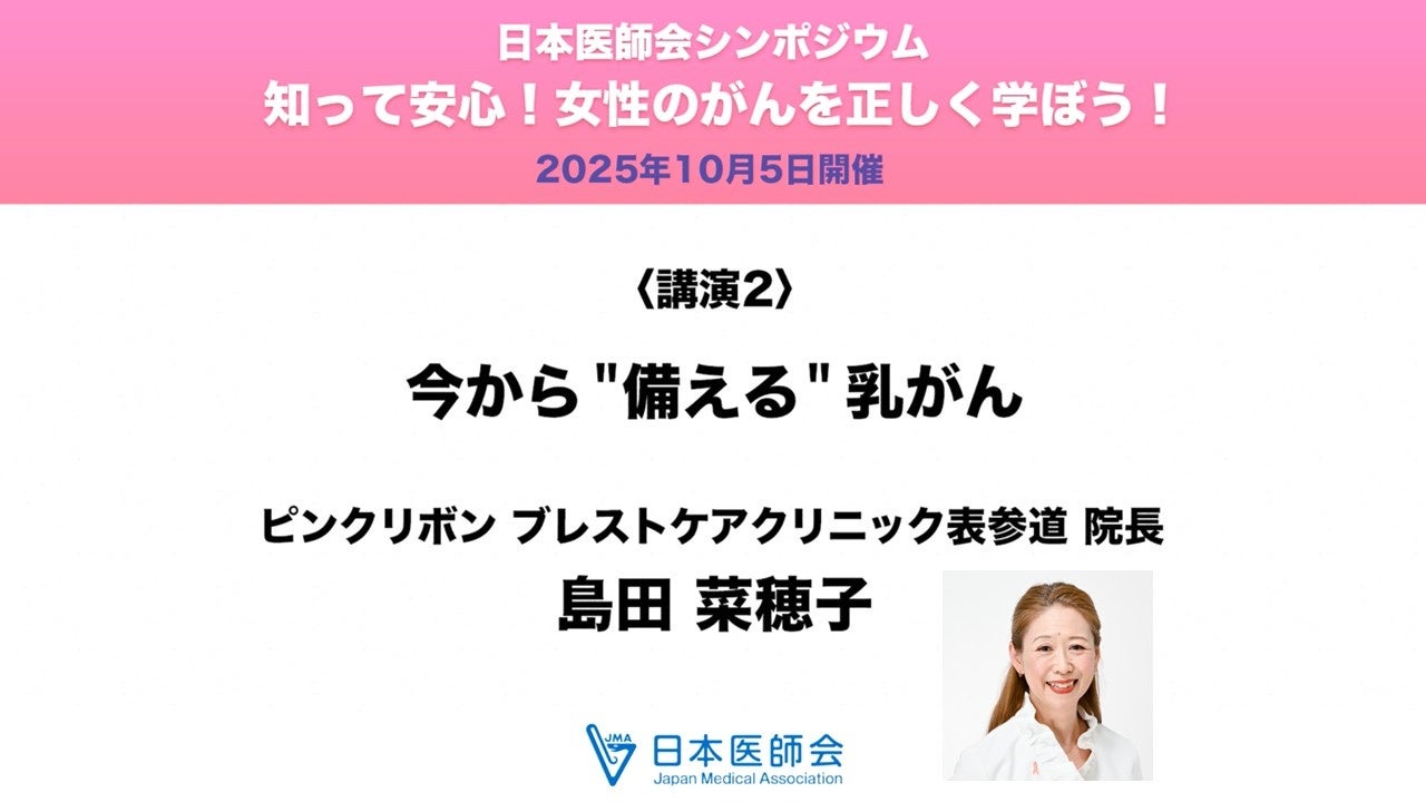 日本医師会(会長:松本吉郎)ではこのほど、公式YouTubeチャンネルで、島田菜穂子ピンクリボンブレストケアクリニック表参道院長が「乳がん」について講演した模様を収録した動画を公開しました。