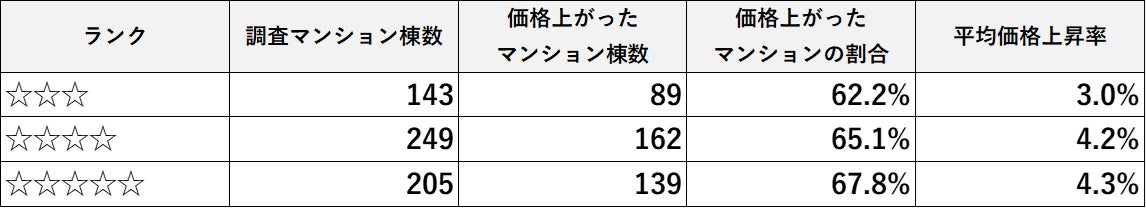 大阪府・京都府・兵庫県の分譲マンションを対象とした分析では、評価が最も高い「星5つ」のマンションの約7割で価格上昇が確認され、平均上昇率は4.3%に達しました。「星4つ」も同様に高水準の結果を示す一方、「星3つ」では価格上昇割合・上昇率ともに大きく低下しています。これらのデータは、「評価が高い」すなわち「管理状態が良好」であるほど、資産価値が維持・向上しやすいことを明確に示しています。