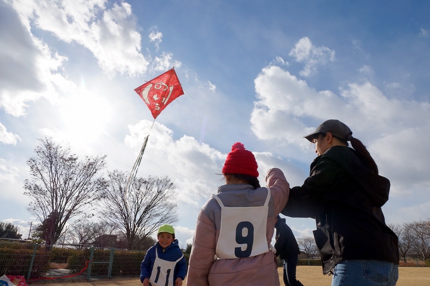 この日は例年にない強風に見舞われて大会は大混戦!強風によって凧が暴れ回ったり、風に乗りきれない凧が続出。一方、上手く風をつかんだ凧は十数メートルまで上昇しますが、今度は子どもの力だけではコントロールが難しくなり、大人もサポート。家族による総力戦と相成りました。