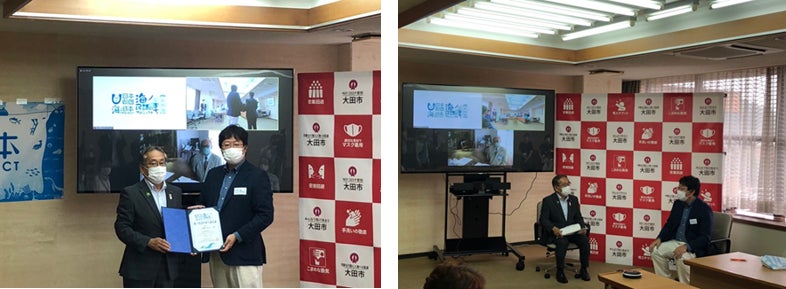 日本中に残された海にまつわる民話を発掘し、その民話のストーリーと、そこに込められた「想い」「警鐘」「教訓」を、親しみやすいアニメーションとして映像化します。当日は、ゼネラルプロデューサーをはじめとする事務局メンバーが「海ノ民話のまち」として認定した15のエリアのうちの1つである島根県大田市の船木三紀夫副市長を表敬訪問し、「海ノ民話のまち」認定証贈呈式を行いました。※ゼネラルプロデューサーはオンライン参加。