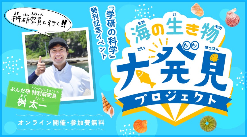 「桝研究員と行く! 海の生き物 大発見プロジェクト」は2022年7月7日に発売した小学生向け科学書籍『学研の科学』の発刊記念イベントとして、また同志社大学 助教 桝太一さんと『学研の科学』編集部のサイエンス・コミュニケーションについての共同研究の一環として、実施いたします。企画については、東京大学三崎臨海実験所が協力監修いたします。