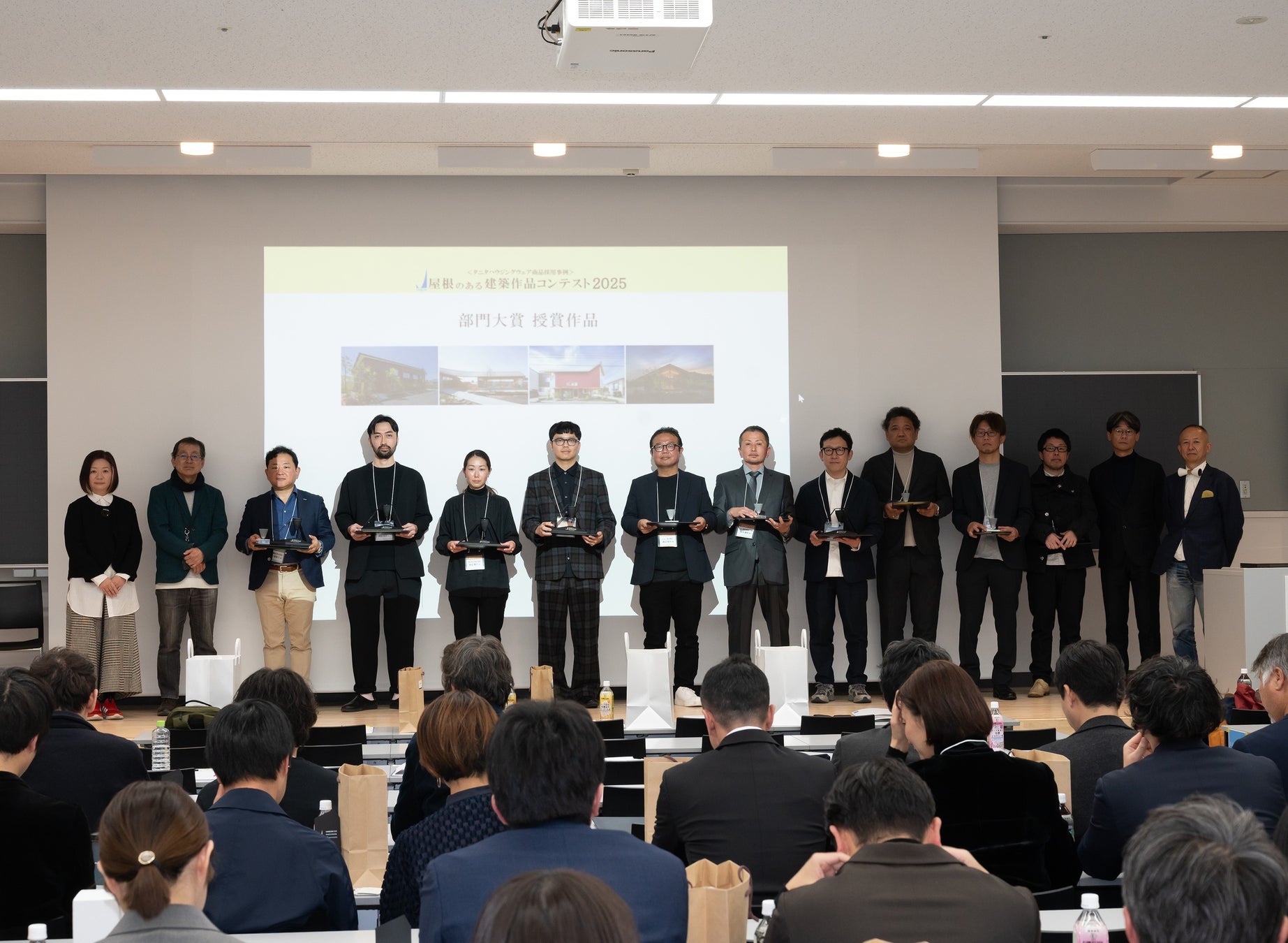 今回のコンテストは、日本大学芸術学部デザイン学科の学生たちがコンテストの「アイコン」および受賞者への「贈呈品」を制作するという、産学連携の試みを取り入れました 。授賞式当日は、学生たちによるプロジェクトの発表も行われ、建築業界と教育機関が一体となった新しいコンテストの形を提示しました 。【産学連携プロジェクト】https://www2.tanita-hw.co.jp/yanecon2025/Project/logo