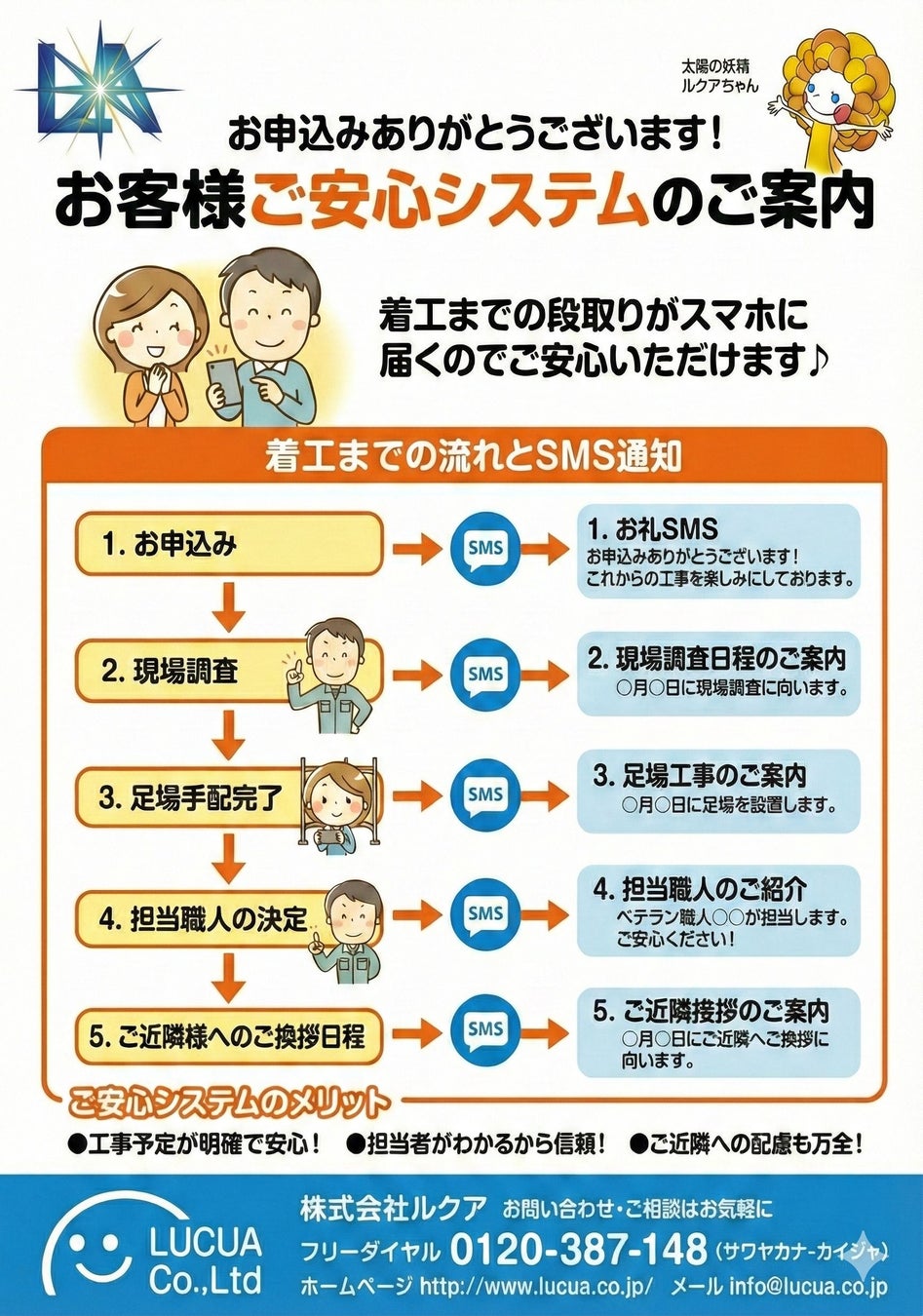 神奈川県、東京都、埼玉県、千葉県を中心に外壁塗装・屋根塗装などの各種リフォーム工事を手掛ける「感動企業」株式会社ルクア(本社:神奈川県横浜市西区、代表取締役:松本 憲二)は、工事のお申込みから着工までのスケジュールや段取り、当日の急な予定変更などを、お客様のスマートフォンへSMS(ショートメッセージサービス)で通知する新サービス「ルクアお客様ご安心システム」の本格運用を開始いたしました。