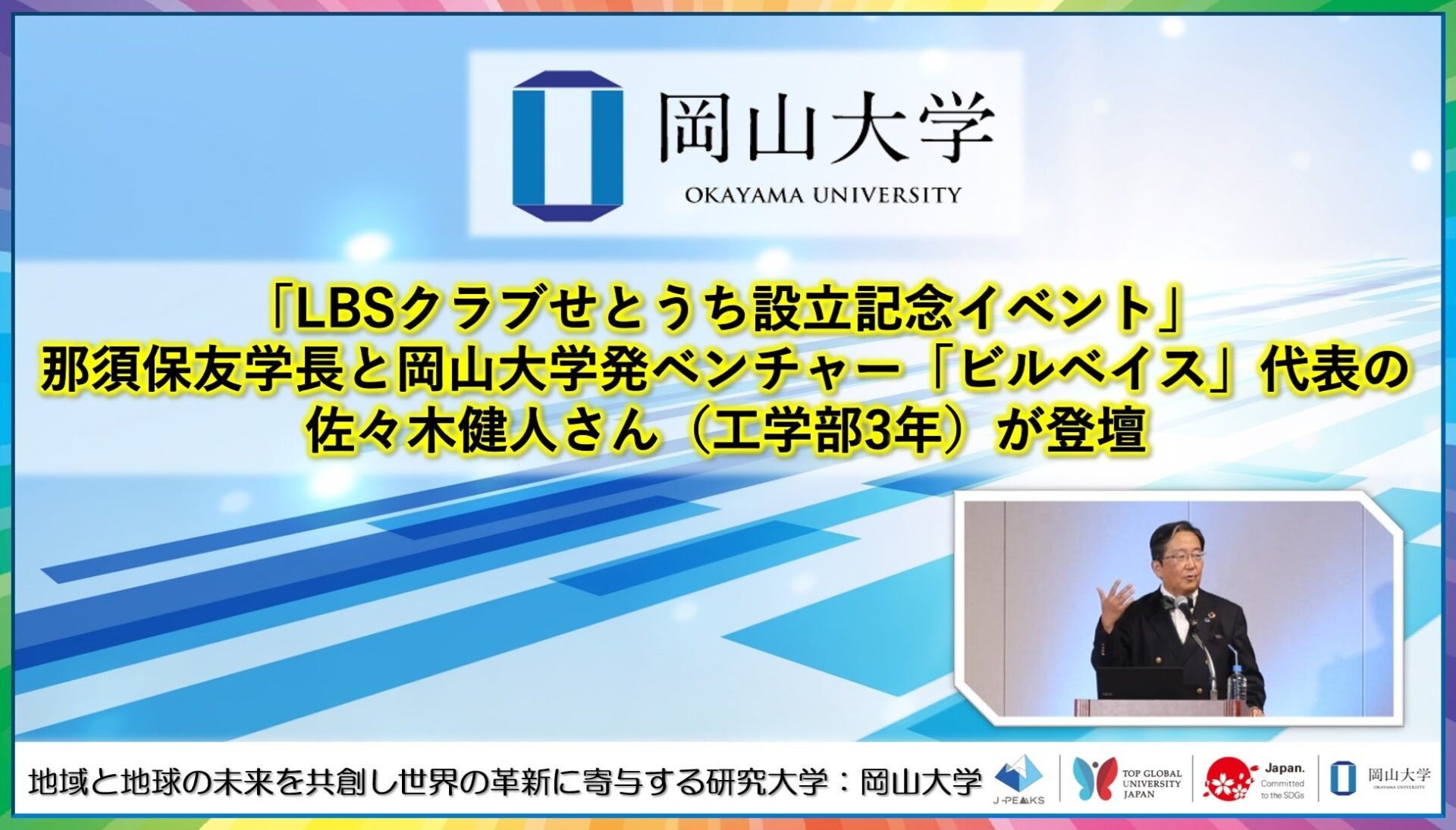 国立大学法人岡山大学(本部:岡山市北区、学長:那須保友)の那須保友学長と工学部3年の佐々木健人さんが2026年2月3日、山陽新聞社にて開催された「LBSクラブせとうち設立記念イベント」(主催:日本経済新聞社、テレビせとうち)に登壇しました。