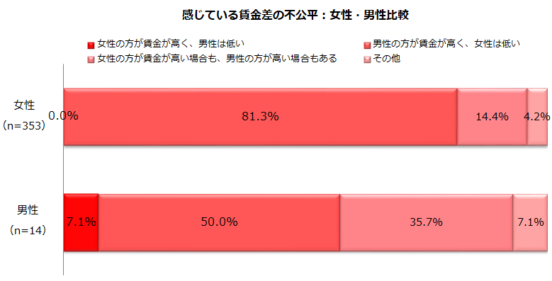 女性か男性かという違いは、賃金に影響を与えているのか。主婦層を中心とする就労志向の女性に、「同じ仕事をしているのに、女性と男性との間で賃金差があり不公平だと感じたことはありますか」と尋ねたところ、「ある」と回答した人が6割を超えました。「ある」と回答した人に、どのような不公平を感じたか尋ねると「男性の方が賃金が高く、女性は低い」が8割を超えた一方、「女性の方が賃金が高く、男性は低い」と回答した人は0%でした。サンプルサイズが小さいため飽くまで参考値ですが、同じ質問に回答した男性は「男性の方が高いと答えた人」が50.0%、「女性の方が高いと答えた人」が7.1%で、「男性の方が高い」と感じる意識は女性の方がより強いのかもしれません。