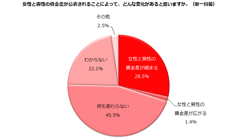 ・男性と女性で賃金に差がある経験をしたことがないのだが(例えば同じ課長職にあって全く同じ仕事を同じ時間だけしていても、男性(女性)であるというだけで他方より基本給が高い?そんな不公平なことが?)、もしそういうことがあるなら、それを公表しなければならないとなったら企業イメージの低下を懸念してその賃金差を解消しようという方向に動くかもしれないと思う(40代:公務員/団体職員)