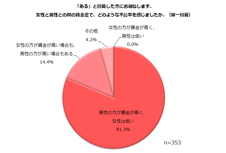 フリーコメントには、女性が家事や育児を担うケースが多いことが賃金に影響しているという声や、賃金だけでなく役職についたり研修を受ける機会も少ないと指摘する声、一方で力仕事などで差がついてしまうのは仕方がないなど、様々な意見が寄せられました。男女間の不公平な賃金差については、同一労働なのに不当に差がついてしまっているあからさまなケースだけでなく、家事育児による仕事上の制約や昇格・教育研修といった成長機会の差が及ぼす影響などについても注意を払う必要があるのだと考えます。