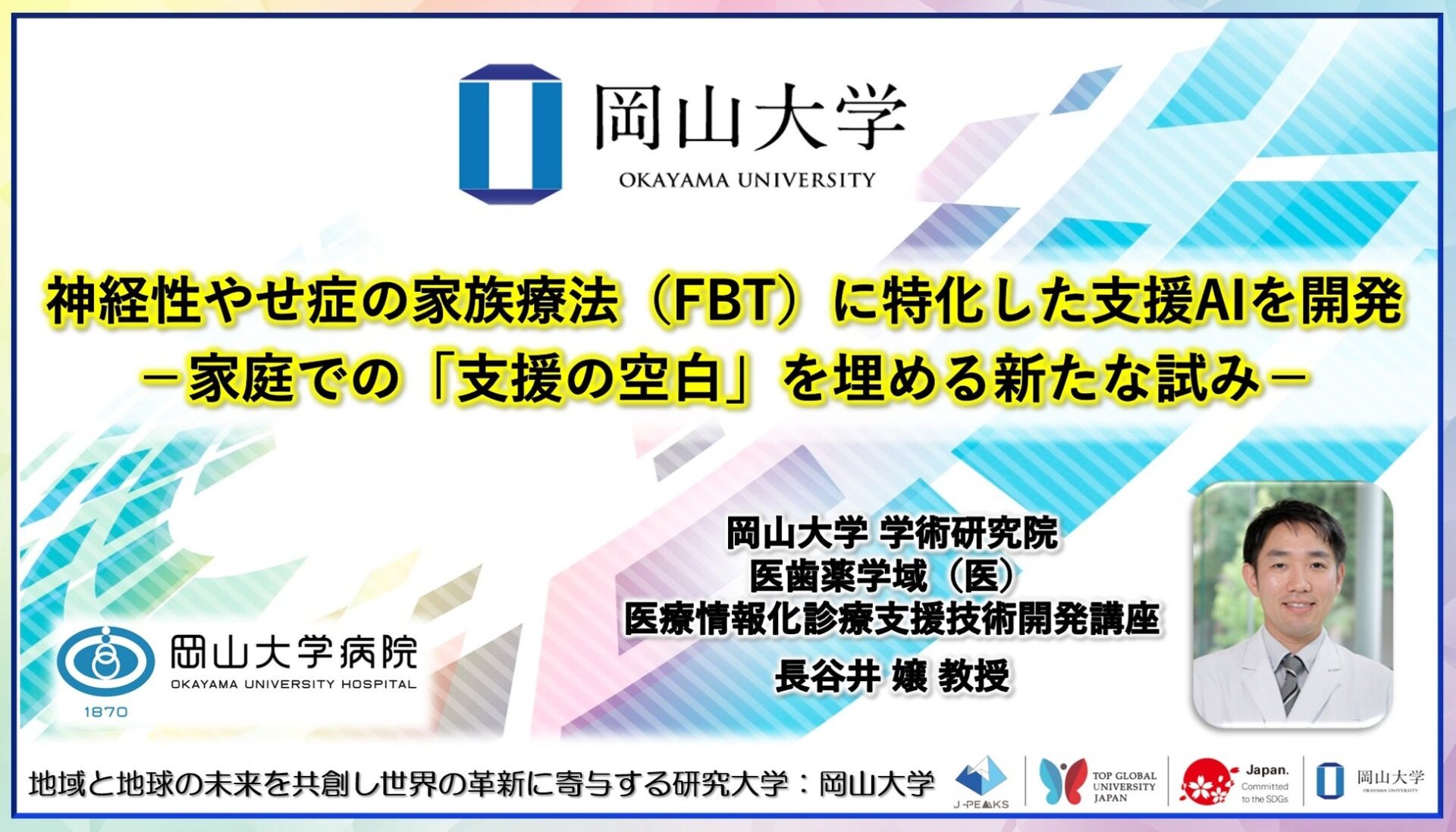 そこで、国立大学法人岡山大学(本部:岡山市北区、学長:那須保友)の学術研究院医歯薬学域(医)医療情報化診療支援技術開発講座の長谷井嬢教授(整形外科)は、岡山大学病院小児心身医療科と連携し、子どもを支える家族を支援するために、家族療法(FBT)の専門知識を学習したAIチャットボットを開発しました。AIが「医療の空白」を埋めるパートナーとなることで、家族の心の負担を減らし、子どもたちの回復を後押しします。