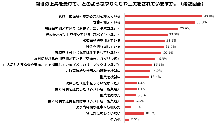 - やりくりや工夫 1位「衣料・化粧品にかかる費用を抑えている」42.9%