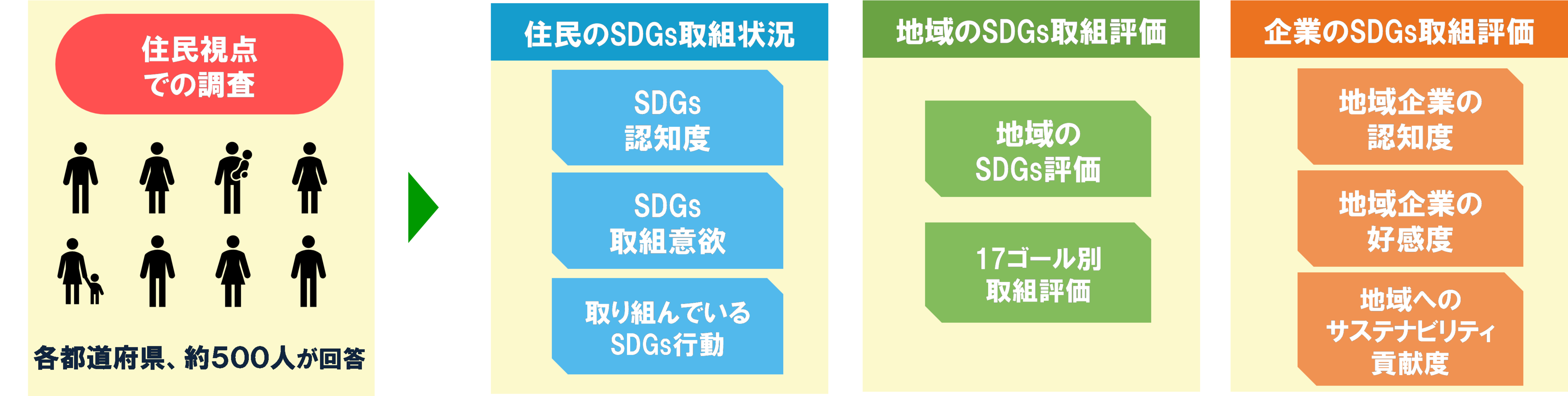 ・調査項目 SDGs指標: 認知度、都道府県別SDGs評価、ゴール別評価、取組意欲