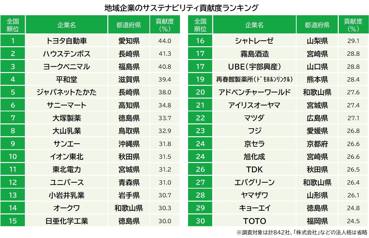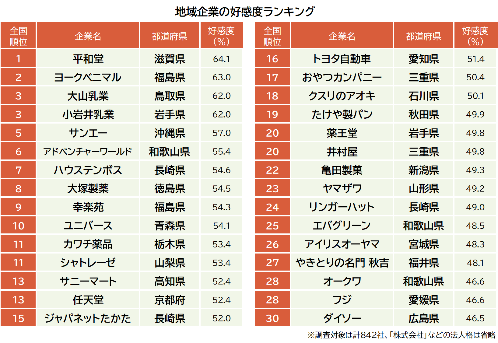 地域企業は各都道府県に本社、または主要拠点がある企業や、その地域で創業した企業のうち、一定の規模を有する企業を選定し、47都道府県全体で842社を対象としました。