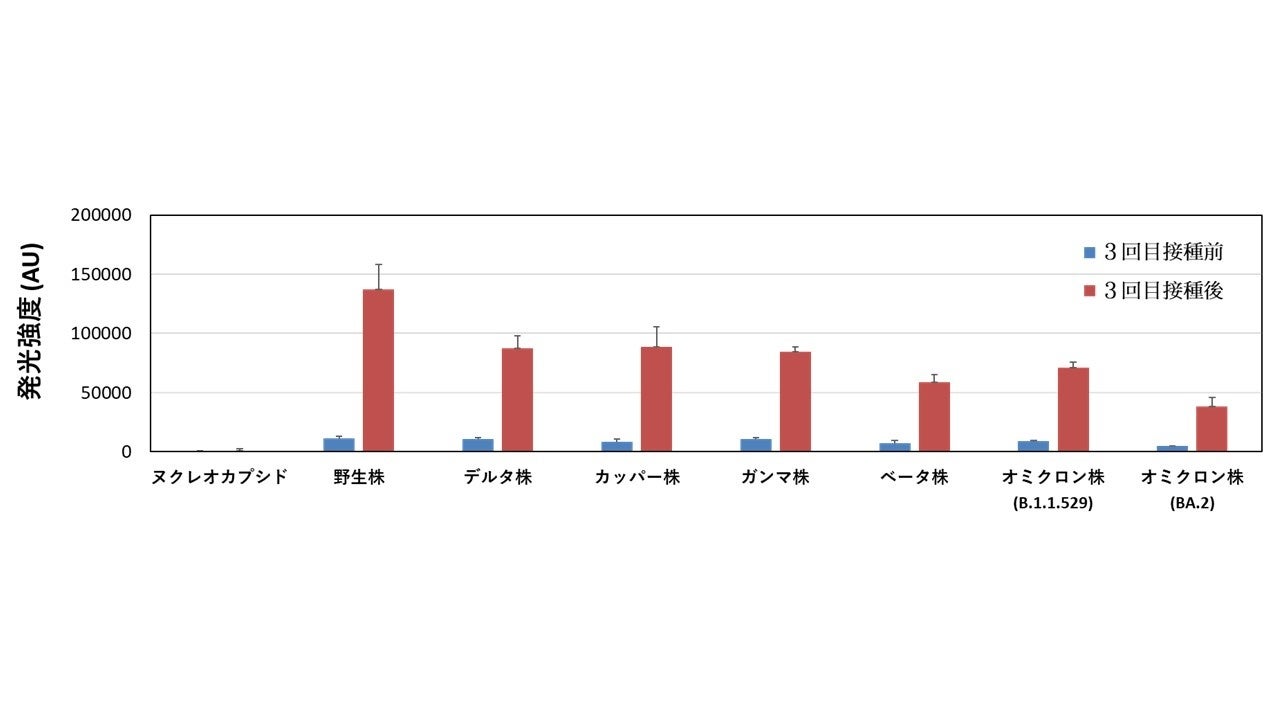 ウイルス内部のヌクレオカプシド・タンパク質と、野生株および5種の変異株のスパイク・タンパク質に対する抗体量を示す。