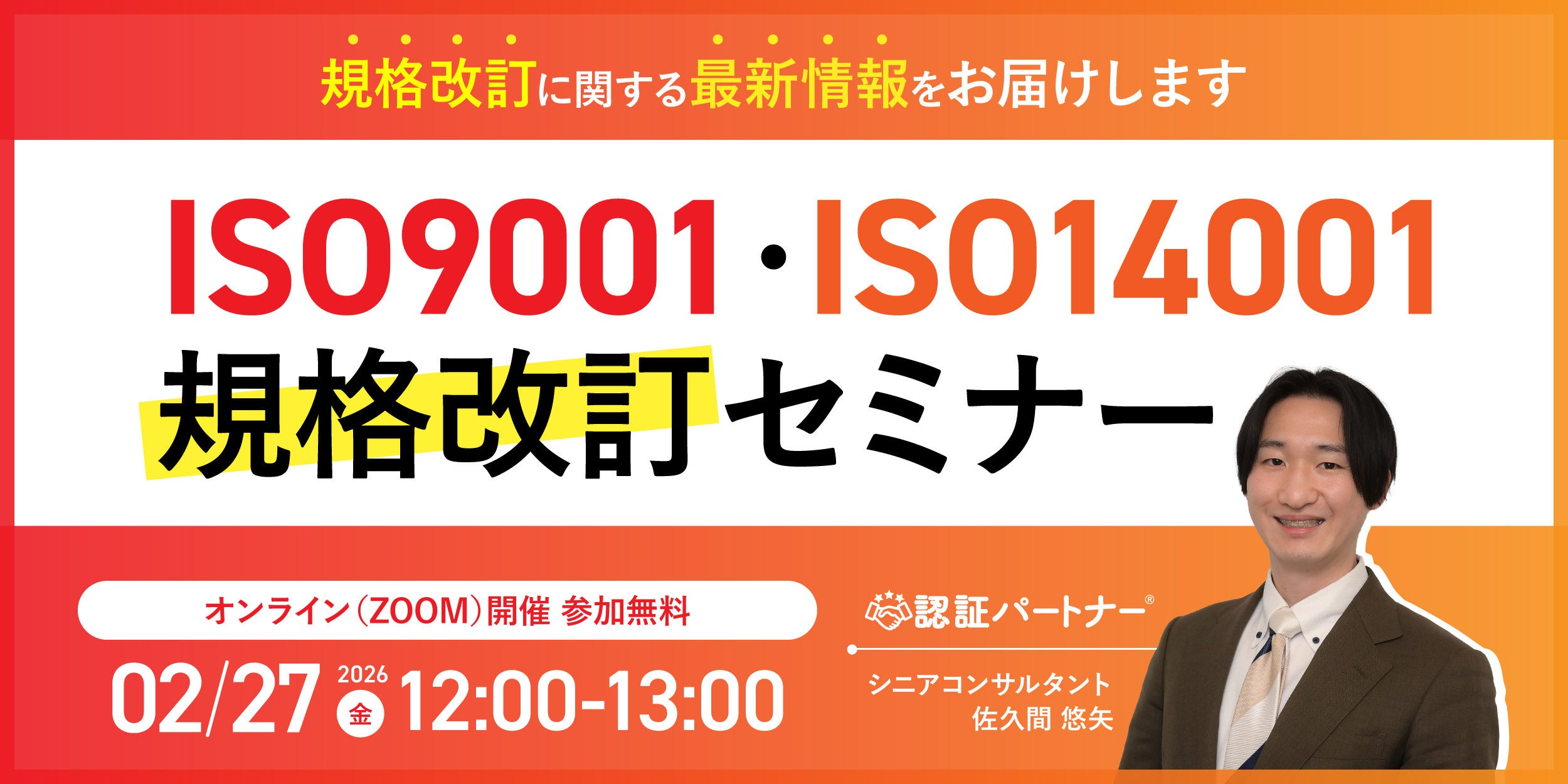 Pマーク、 ISOコンサルにおける支援実績 No.1(注1)のISO/Pマークの取得・運用支援サービス「認証パートナー」を提供する株式会社スリーエーコンサルティング(本社:大阪府大阪市、代表取締役社長:竹嶋 寛人)は、2/27(金)12:00-13:00「ISO9001・ISO14001規格改訂セミナー」を開催します。2026年に予定されているISO9001・ISO14001の規格改訂について、先行情報を知りたい方や改訂に不安を感じている方に向けて、ISOの専門家が規格改訂の解説や2026年版の改訂内容、さらに改訂対応に必要なポイントを分かりやすくお伝えします。