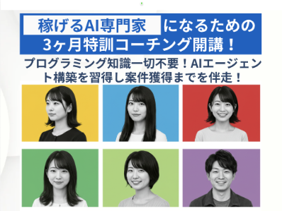 AI版ライザップのような、AIエージェント構築を専門としたマンツーマンコーチング形式のAI学習スクール「COACHAI(コーチAI)」を展開しています。国内初の、案件が取れなければ全額返金保証付きで、徹底的に最短3ヶ月でプロデビューを目指していきます。
