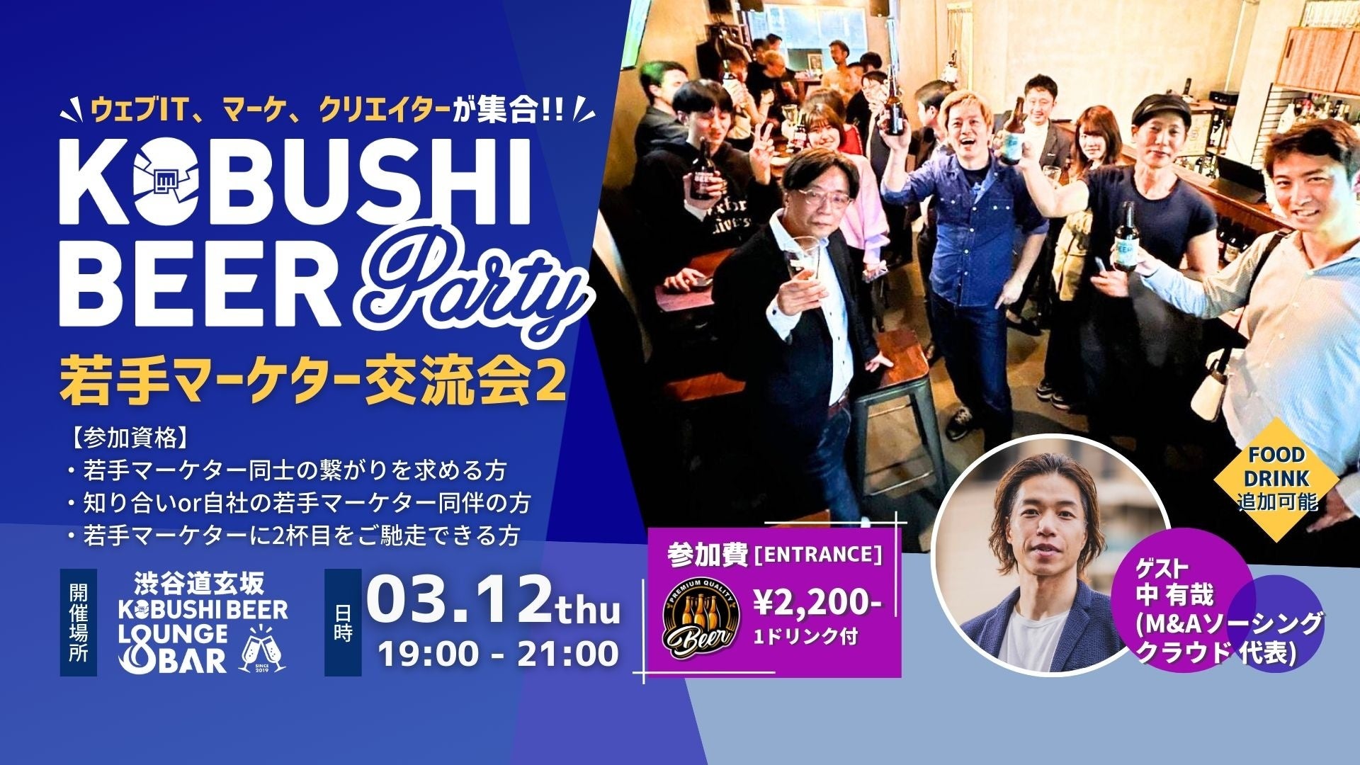 KOBUSHI MARKETING合同会社(東京都渋谷区、代表:井上裕介)が運営する渋谷道玄坂の『KOBUSHI BEER LOUNGE & BAR』では、人と人とを繋ぐユニークな取り組みを行い多くのビジネスチャンスを生み出している。そして今回、2026年3月12日(木)19:00~M&Aソーシングクラウドの中代表をゲストに迎え、若手マーケターが集まる交流会を開催すると発表した。