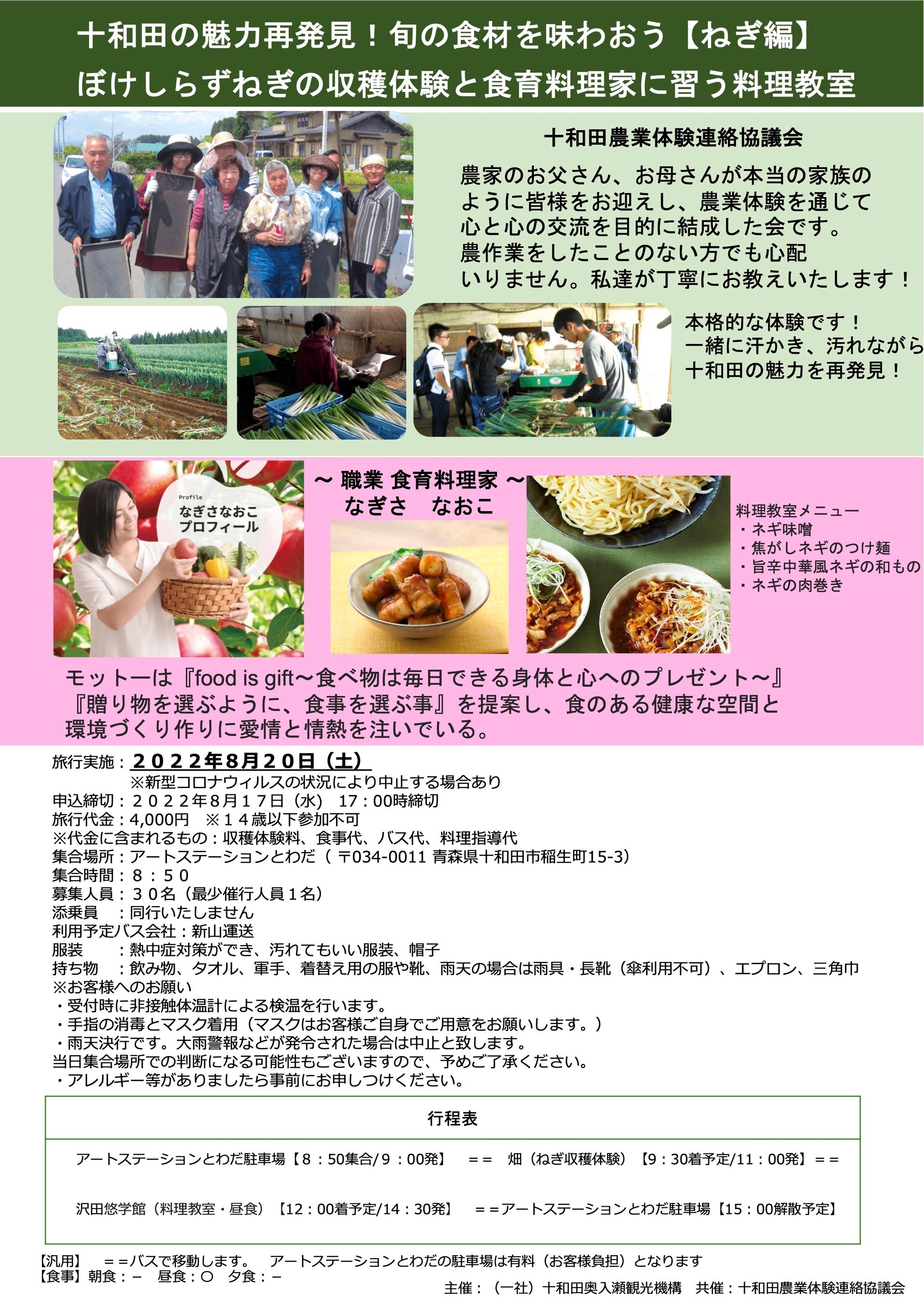 こういった魅力的な食材を、十和田農業体験連絡協議会の作業指導のもとで汗をかきながら収穫し、食育料理家であるなぎさ なおこの教室で調理に使うのがツアーの内容です。ねぎ味噌、旨辛中華風ねぎの和えもの、ねぎの肉巻き、焦がしねぎのつけ麺、自ら作った健康な昼食メニューを味わって、農業資源が豊かな十和田市の素晴らしさを再発見いただければ幸いです。