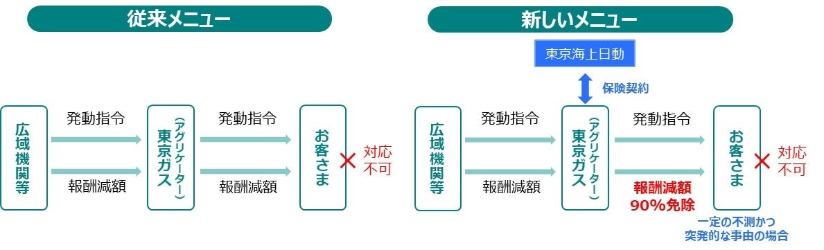 東京ガスが提供する新メニューでは、東京海上日動の保険を活用することで、企業や自治体等のお客さまがリソースの発動指令に対応できない場合でも、一定の不測かつ突発的な事由であれば、報酬の減額が90%免除となります。従来よりも報酬減額リスクが大幅に緩和されることから、お客さまが安心してVPPに参加することができます。