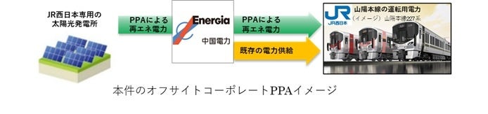 西日本旅客鉄道株式会社と中国電力株式会社は、再生可能エネルギー由来電力(以下、再エネ電力)を列車運転用電力として供給する、オフサイトコーポレートPPA(Power Purchase Agreement:電力購入契約)を新たに締結しました。