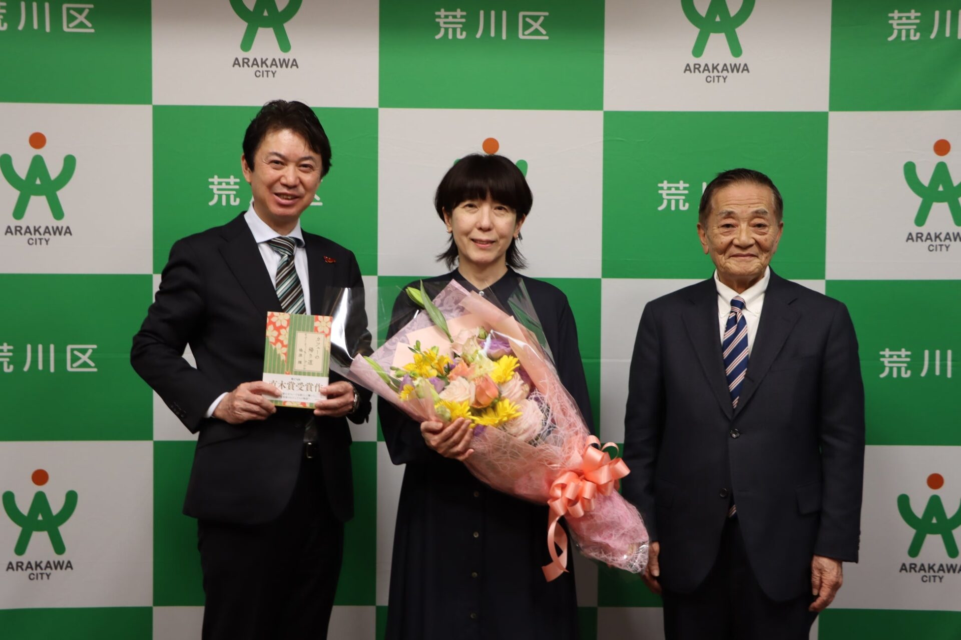 本日(3月3日(火))、「カフェーの帰り道」で第174回直木賞を受賞された、荒川区出身の小説家、嶋津輝さんが荒川区役所に来訪され、滝口学区長と荒川区議会の斎藤泰紀議長から、花束とともにお祝いの言葉が伝えられました。
