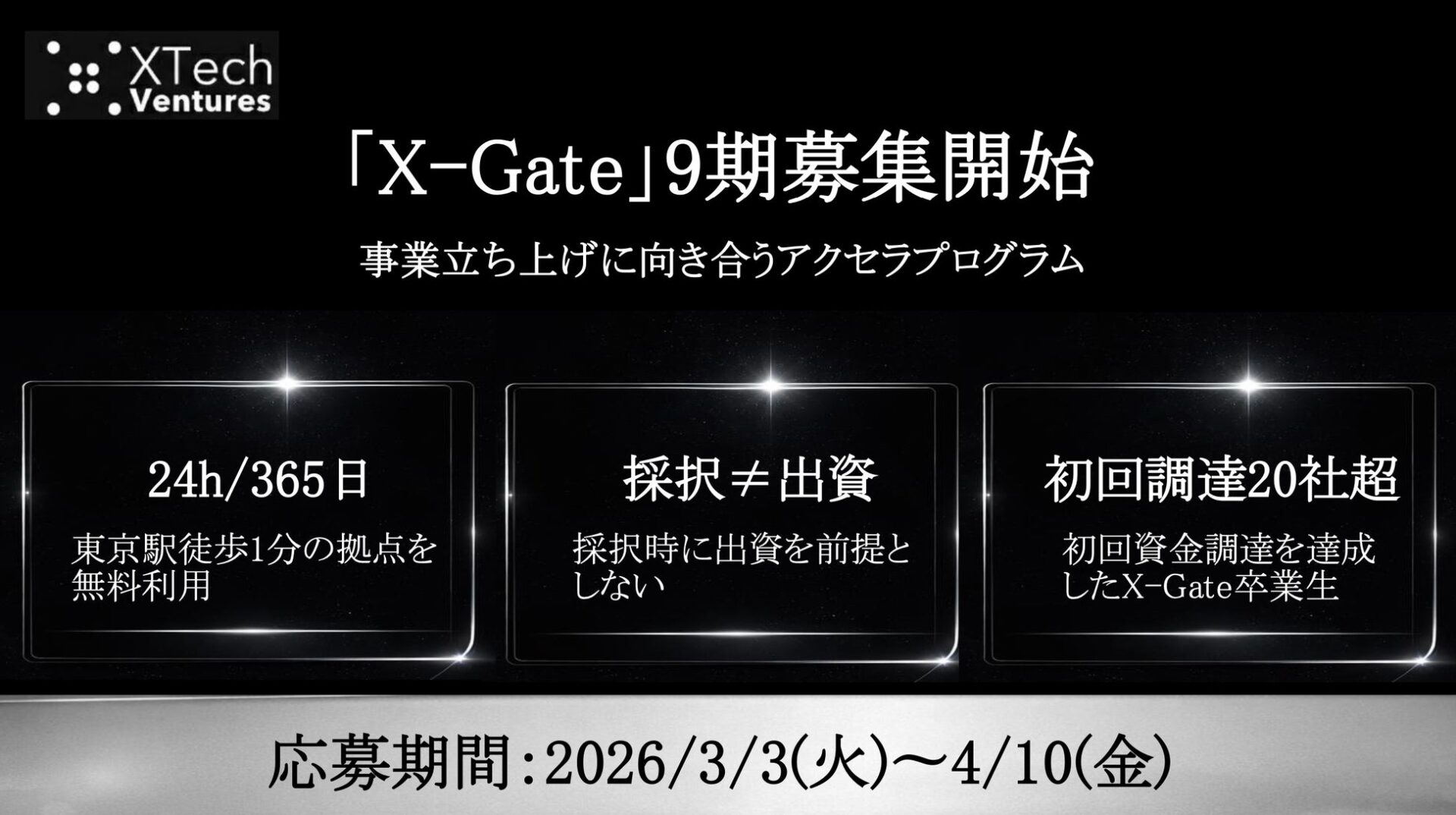 XTech Venturesが運営する東京駅徒歩1分のシェアオフィス『xBridge – Yaesu(クロスブリッジ八重洲)』にて、創業支援・事業伴走を行うアクセラレーションプログラム『X-Gate(クロスゲート)』、本日より第9期の参加者の募集を開始いたします。本プログラムは、多数の新規事業立ち上げや上場企業の経営経験を持つ代表パートナー陣をはじめ、XTech Venturesのメンバーを約4ヶ月間にわたり「出資検討の前段階から」存分に活用いただけるものです。「まずはVCの知見を借りたい」「事業の解像度を極限まで高めたい」という、起業準備中や起業直後の方々の挑戦をお待ちしております。