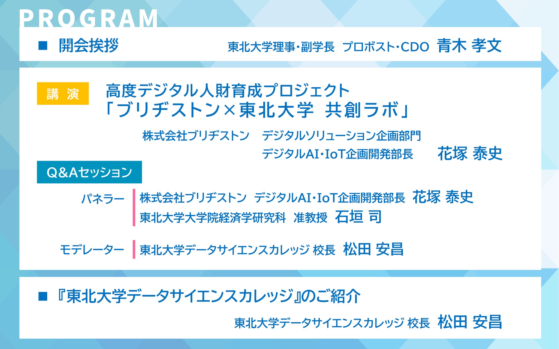 本セミナーでは、東北大学の共創研究所制度を活用して、株式会社ブリヂストンと東北大学が強力な連携協力体制を構築し、高度なスキルを有する実践的なDX人材を育成する取り組みをご紹介します。