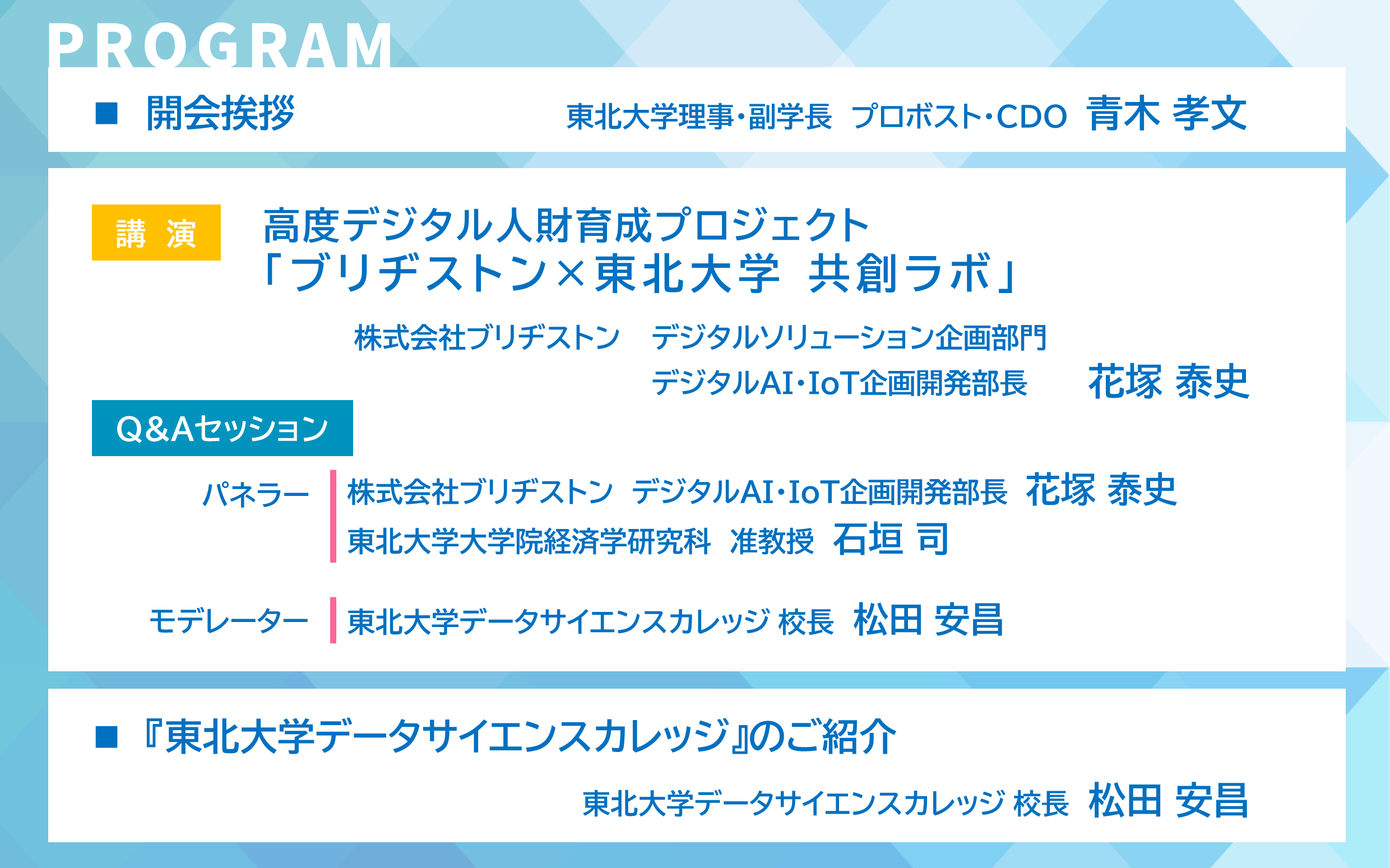 本セミナーでは、東北大学の共創研究所制度を活用して、株式会社ブリヂストンと東北大学が強力な連携協力体制を構築し、高度なスキルを有する実践的なDX人材を育成する取り組みをご紹介します。