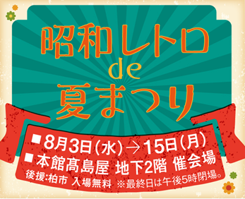 本コンテンツは、8月3日から8月15日まで高島屋柏店で行われる『昭和レトロde夏祭り』にてご体験できます。