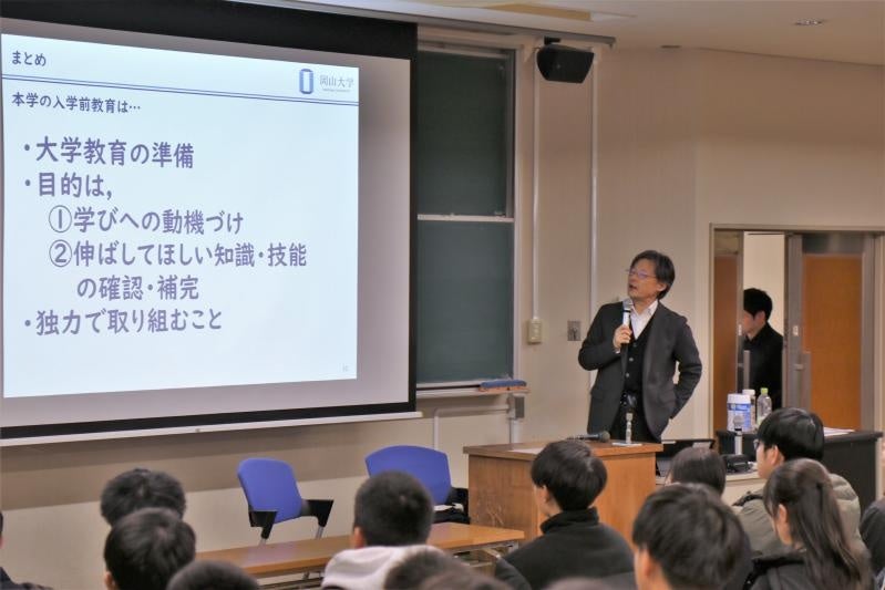 前半では、はじめに高橋規一工学部長が歓迎のあいさつを行い、続いて坂倉彰副学部長が入学前教育の趣旨や大学で求められる学びの姿勢について説明しました。入学予定者は真剣な表情で耳を傾け、大学生活への理解を深めていました。