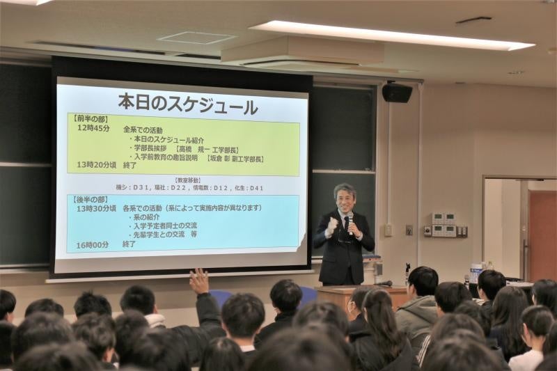 前半では、はじめに高橋規一工学部長が歓迎のあいさつを行い、続いて坂倉彰副学部長が入学前教育の趣旨や大学で求められる学びの姿勢について説明しました。入学予定者は真剣な表情で耳を傾け、大学生活への理解を深めていました。
