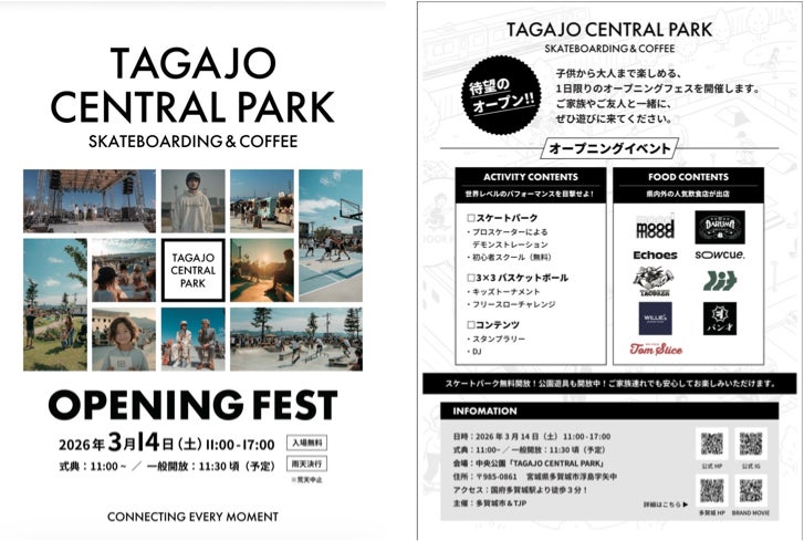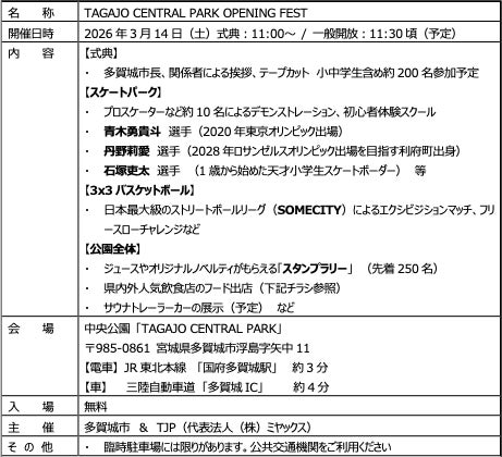 株式会社ミヤックス(代表取締役 社長執行役員:髙橋蔵人、本社:宮城県仙台市)を代表構成団体とするTJP(*1)は、多賀城市の中央公園整備を進め、このたび日本屈指の規模を誇る屋外約3,600㎡、屋内約900㎡のスケートボードパークを中心とした複合施設「TAGAJO CENTRAL PARK」を整備しました。3×3バスケットボールコートや遊具エリア、カフェ「Tagajo Central Park Coffee」などを備え、子どもから大人まで楽しめる都市型スポーツ公園として、2026年3月14日に開園、同日オープニングイベントを開催します