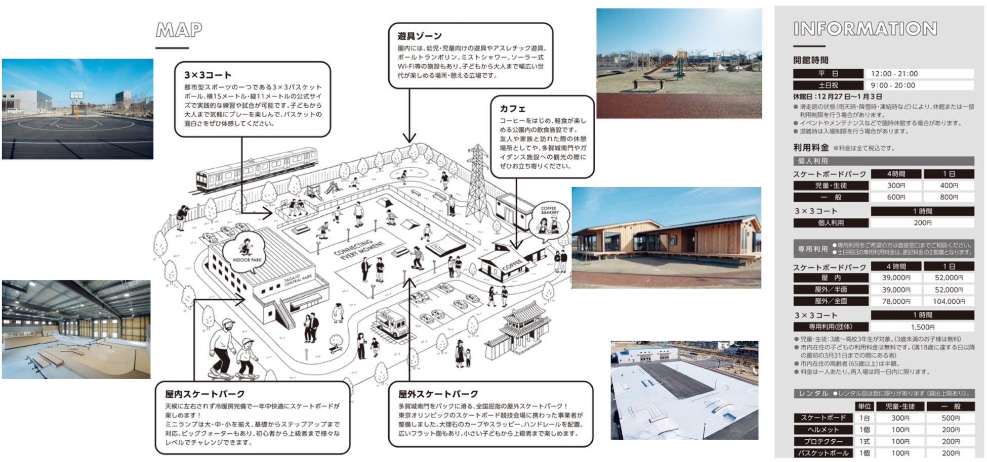 公園の全体像、開館時間、有料施設である屋内外スケートボードパーク、3×3コートの利用料金などは下記の通りです。