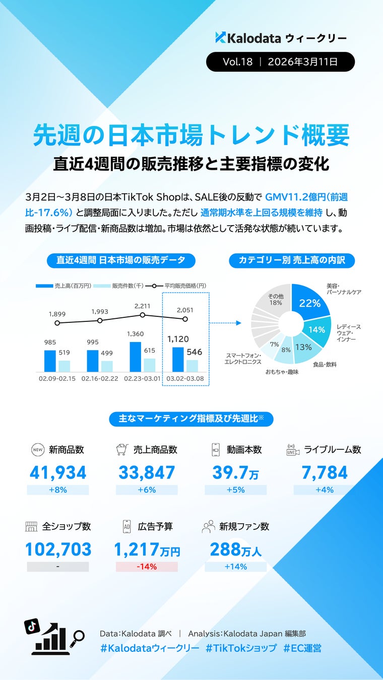TikTok Shopデータ分析サービスKalodata Japan(運営:株式会社Kalowave Japan)の最新データによると、2026年3月2日〜3月8日の日本TikTok Shop市場は前週の大型セールの反動によりGMV11.2億円(前週比−17.6%)となりました。