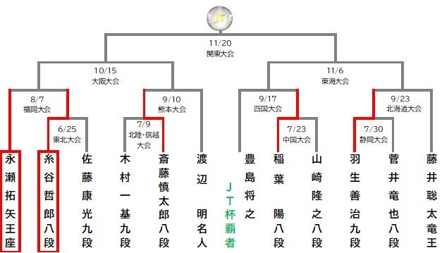 両者の対戦は、8戦して永瀬王座の6勝2敗。永瀬王座は振り飛車党だったが、後に居飛車党に転向した。「将棋は才能でなく努力」が持論であり、将棋に対するストイックな姿勢から、付いた異名は「軍曹」。長期戦を厭わず、負けない将棋を指すのが身上。対する糸谷八段は早見え早指し。居飛車党で角換わりを得意とするが、形にこだわらない奔放な一面があり、道なき道を行くような力戦はむしろ望むところ。過去の戦型は、最初の対戦こそ永瀬王座の中飛車だったが、その後は角換わり系の相居飛車の将棋がほとんどで、腰掛け銀と早繰り銀が多い。JT杯では昨年も対戦があり、先手の糸谷八段が注文を付けた変則的な相居飛車戦だった。過去の傾向から考えて角換わりになる公算が高い。糸谷八段がどこかで定跡から外れて力将棋に持ち込もうとし、それを永瀬王座が迎え撃つ展開になると思われる。永瀬王座がシード棋士の貫録を見せるか、糸谷八段が昨年のリベンジを果たすのか、注目の一局である。