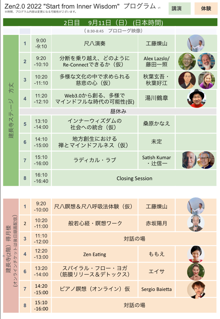 「Start from Inner Wisdom 〜 The stories of interbeing 全ての物語と共に生きる 〜」をテーマに、グローバルで多様性溢れるプログラムをご用意。最新の叡智に触れることができる対談型のセッションのみならず、建長寺にてリアルに参加される皆さまが「体感」「対話」できる、実践型のプログラムも数多く予定しています。