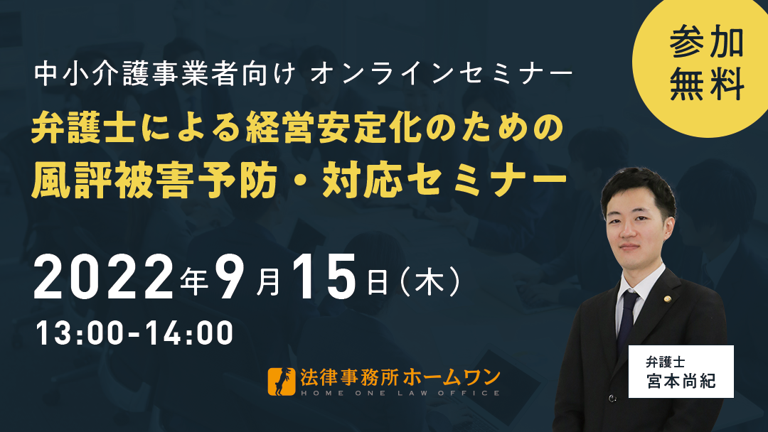 弁護士法人法律事務所ホームワン(所在地:東京都中央区、代表:中原 俊明)は、『弁護士による経営安定化のための風評被害予防・対応セミナー((無料・オンライン)―リスクの発見と早期対処で、職員・利用者の安心と信頼を守る―』を2022年9月15日(木)に開催いたします。