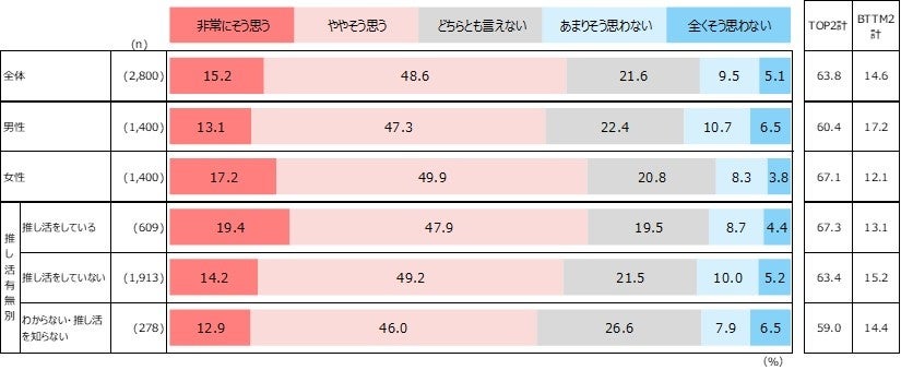 幸福度(「非常にそう思う」+「ややそう思う」の計)は63.8%となりました。性別では男性60.4%に比べ女性は67.1%と、女性の方が6.7pt高い結果に。推し活有無別では、推し活をしている人の幸福度は67.3%、していない人は63.4%となり、推し活をしている人の方がやや幸福度が高いという結果になりました。