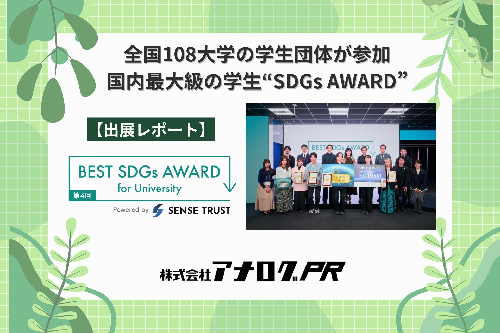 「企業の情報と印象をデザインする」をコンセプトに掲げ、メディアとWEBとオフラインを融合させたマーケティング戦略を提供する、株式会社アナログPR(本社:東京都港区、代表取締役:松浦啓介)は、2026年2月22日(日)にトンネル東京(セガサミーホールディングス株式会社本社)で開催された「第4回 BEST SDGs AWARD for University」に企業ブースを出展いたしました。