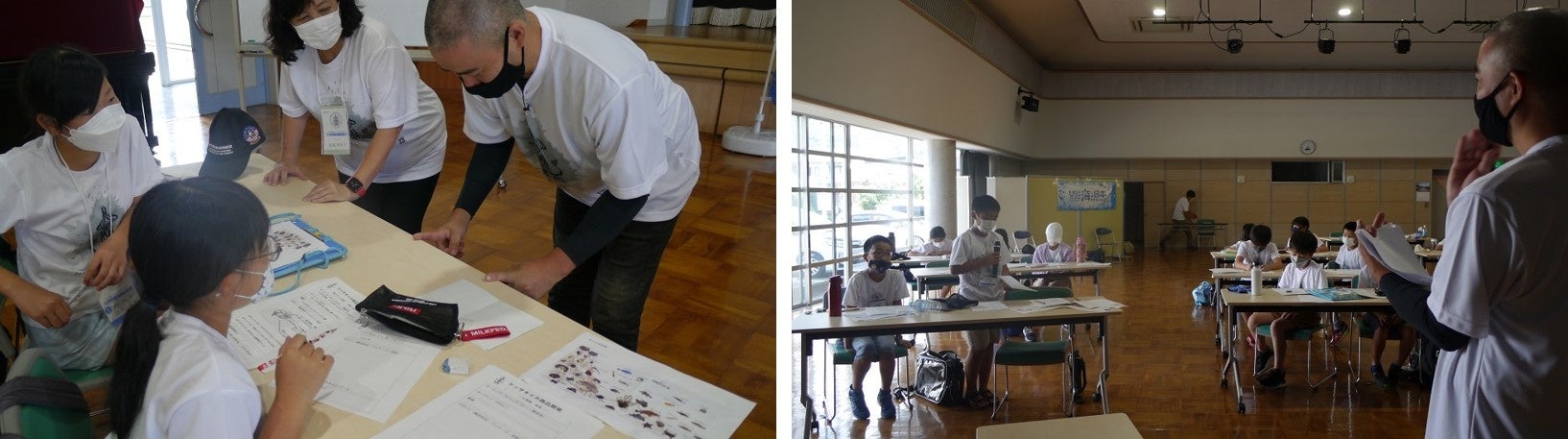 講義の中盤以降は、その豊かな海を脅かす存在についての説明が行われました。スクリーンには、ある日突然海面を覆ったおびただしい数の白いものが映されます。「これ何かわかりますか?」「発泡スチロール!」プラスチック等の人工物は、自然にかえることなく残り続けます。そこで白井先生から一言。これまで現地で見つかっていた化石は貝類などの自然のものばかり。ごみなどの人工物が見られるようになったことで、このままだと未来の人はどんな化石を見つけるんだろう…?隊員たちに考えて書いてもらいました。スマホ、カメラ、アクセサリーなど、身近なものが沢山出てきました。「こんな化石が将来見つけられないようにするためには、これから私たちはどうすればいいと思いますか?」「拾う!」「捨てない!」隊員たちにも、海を守り、次の世代に引き継ぐための心構えがしっかりと出来たようです。