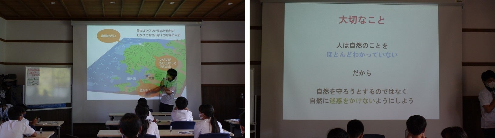 DAY2のスタートは、前回同様萩・明倫学舎。体験1日目(DAY1:7月3日実施)では、マグマの活動を物語る白と黒のストライプとなったダイナミックな海岸の景色を、イカ釣り漁船に乗船してのクルージングや現地踏査で確認し、その成り立ちが豊かな海につながっていることを学びました。今回は座学で復習。ホルンフェルスの現地踏査でも講師を務めていただいた萩ジオパーク専門員の白井孝明さんに、改めて資料をもとに講義を受けました。隊員たちは、DAY1で現地で見た景色を今日は写真で改めて見て、地形がどのようにして生まれたかの説明を受けました。現地を見て学んだことに加え、改めて復習をしたことで、隊員たちの萩ジオパークの海に対する理解はより深まったようです。
