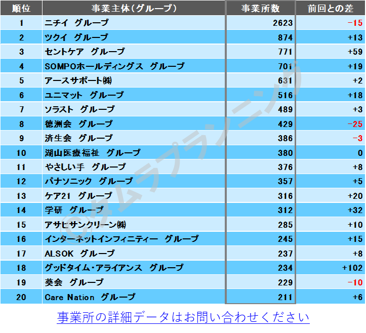 ランキング1位は前回(2021年7月時点)から引き続き「(株)ニチイ学館」となり、圧倒的な事業所数で2位以下を大きく引き離しています。