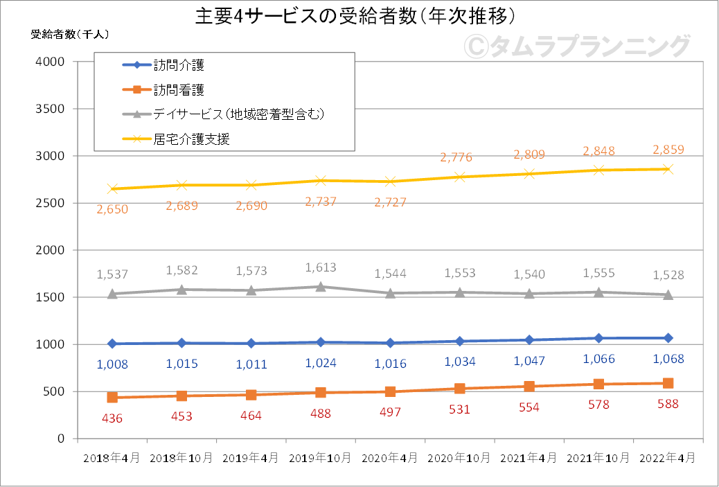 特に訪問看護は、コロナ前の2020年1月時点と比べると、2022年1月~4月の受給者数は概ね15%~19%の増加となっており、同サービスへの高いニーズが窺える結果となっています。