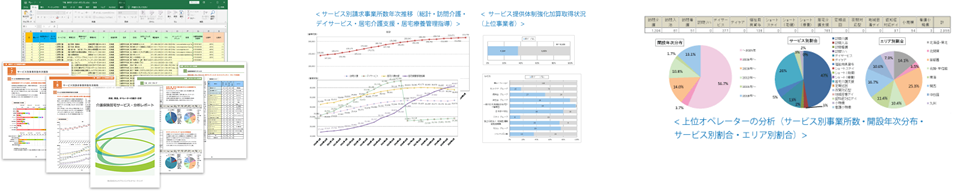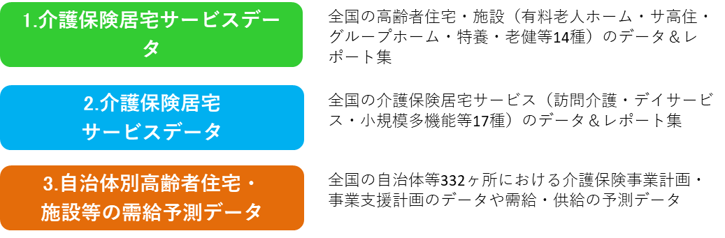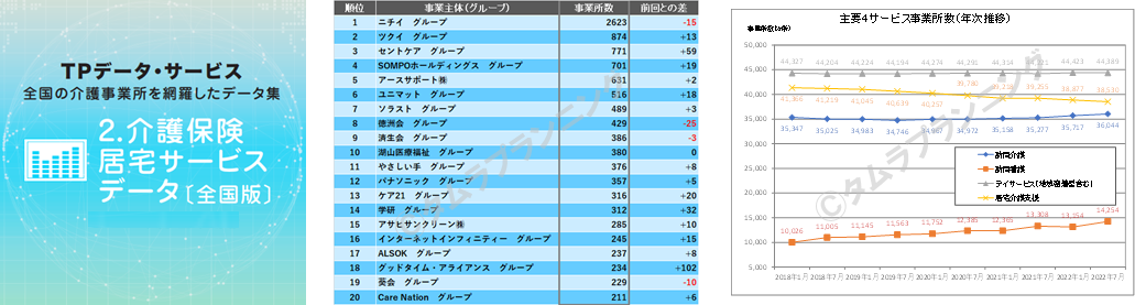 このデータは、全国・全17種類・約18.4万ヶ所の介護保険居宅サービスの事業所を収録し、介護保険居宅サービスの業界動向をワンストップで把握できるデータになっています。